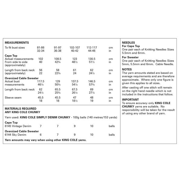 King Cole Pattern 6378 Cape Top and Oversized Cable Sweater in Simply Denim Chunky