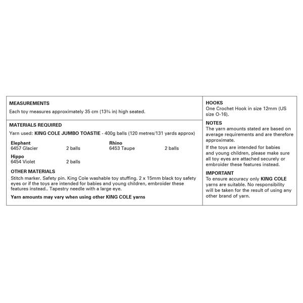 King Cole Pattern 9217 Elephant, Hippo and Rhino Toys Crocheted in Jumbo Toastie